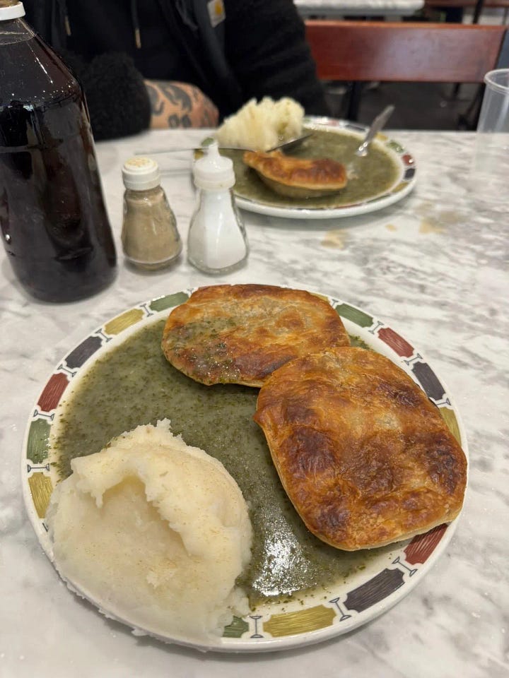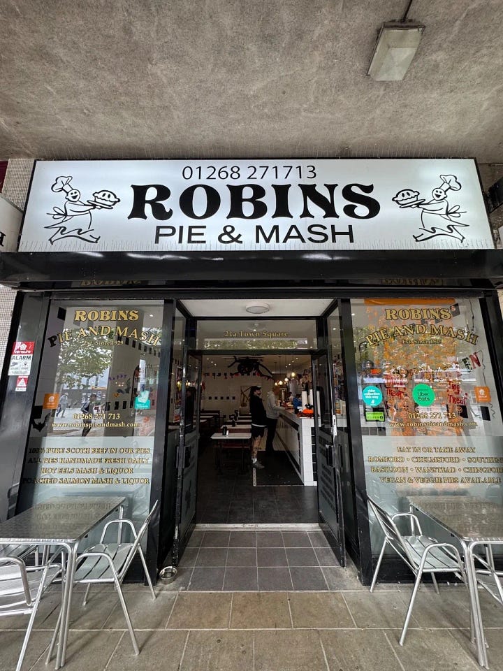 Before heading home, I stopped by Robin’s Pie & Mash in the town centre -an Essex institution since 1929! A proper family-run spot that’s been serving the same pie, mash and liquor for five generations. I used to spend my (limited) pocket money there, grabbing a sneaky pie between my two buses home from school. It was also the place I had my first ever date.